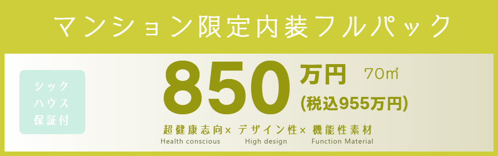 マンションの住戸で、面積約70㎡の内装をまるごと無添加リノベーションした場合限定で、850万円+消費税85万円=955万円のフルパッケージ価格でご提供いたします。