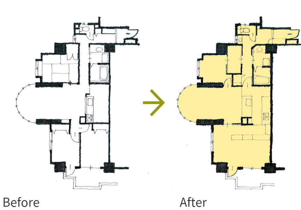 例えば、新築分譲時で子供部屋が2室あった場合、もう成長して独立していくと、必要なくなるので、2室を1室に統合したり、手狭で暗かったキッチンを対面にし、LDKの主役にすることも可能です。