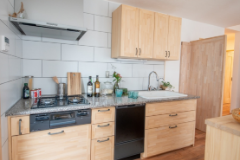 無添加オリジナルキッチン(天然石天板、ホーローシンク、木製キャビネット、シングルレバー水栓、ガスコンロ、レンジフード、吊戸棚)